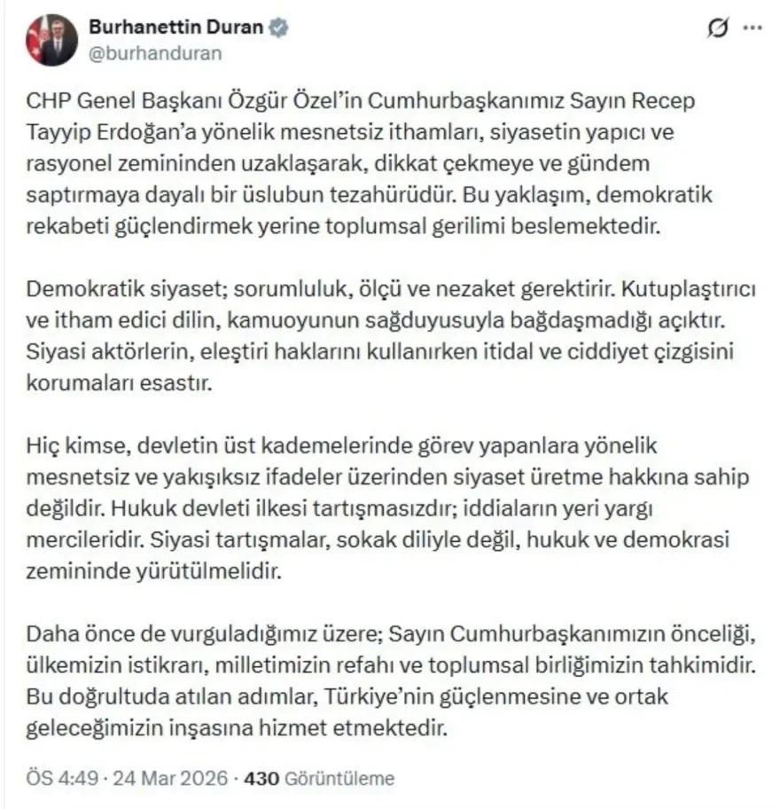 İletişim Başkanı Burhanettin Duran, CHP Genel Başkanı Özgür Özel’in Cumhurbaşkanı Recep Tayyip Erdoğan’a yönelik haksız suçlamalarını eleştirerek, “Bu yaklaşım, siyasetin yapıcı ve rasyonel zemininden uzaklaşarak, dikkat çekme ve gündem saptırma çabasının bir göstergesidir. Demokratik siyaset, sorumluluk, ölçü ve nezaket gerektirir” dedi. Duran, sosyal medya hesabından yaptığı paylaşımda, Özel’in açıklamalarının toplumsal gerilimi artırdığını belirtti. Duran, “Kutuplaştırıcı ve itham edici bir dil, kamuoyunun sağduyusuyla bağdaşmamaktadır. Siyasi aktörlerin eleştiri haklarını kullanırken itidal ve ciddiyet çerçevesinde hareket etmeleri önemlidir. Hiç kimse, devletin üst kademelerinde görev yapan kişilere yönelik haksız ve yakışıksız ifadelerle siyaset üretme hakkına sahip değildir. Hukukun üstünlüğü ilkesine saygı göstermeli ve iddialar yargı mercilerinde değerlendirilmelidir. Siyasi tartışmalar, sokak diliyle değil, hukuk ve demokrasi zemininde yürütülmelidir. Cumhurbaşkanımızın önceliği, ülkenin istikrarı, milletin refahı ve toplumsal birliğimizin güçlendirilmesidir. Atılan bu adımlar, Türkiye’nin güçlenmesi ve ortak geleceğimizin inşası için kritik öneme sahiptir” ifadelerini kullandı. Yazar: Mehmet Karaman